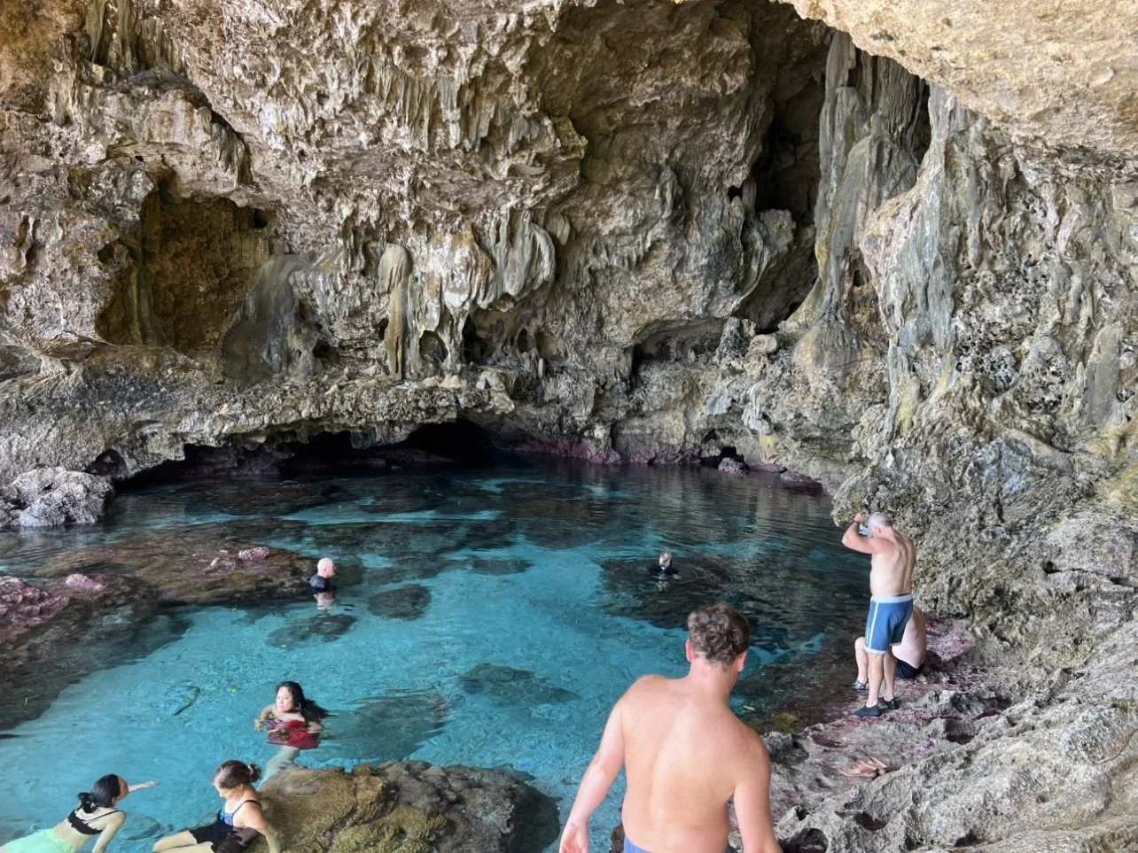 After a picnic lunch back by the minibus, we all piled in once again to our next destination, the Avaiki cave on the other side of the island. The chasms were going to be a hard act to follow, but these caves did not let us down! The cave was home to a bright blue pool, with patches of pink and orange coral dotted throughout. Further up the road, we visited the Limu pools next, which were a collection of pools that were a combination of sea water and fresh water running from the land. John made friends with a few of the local sea snakes, some being fiestier than the others. We finished our grand tour with one final stop at a lookout Andrea had picked out. It was a fantastic view of the ocean we had just sailed through, and would be returning to shortly.