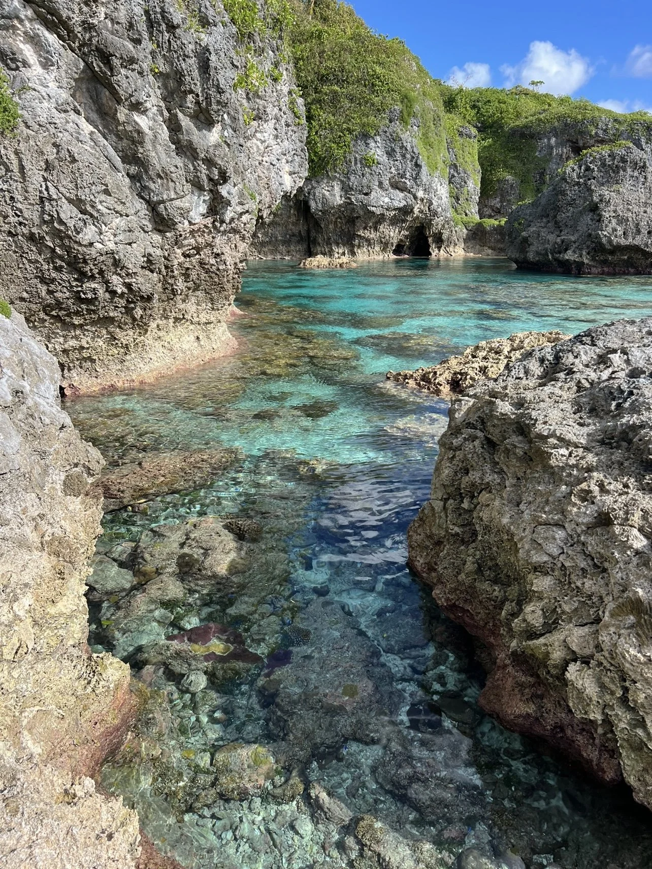 The trailhead to the Togo Chasm is about a 40 minute drive from Alofi, and then another short walk through the forest until it opens up to a panoramic view of the Southeast coast of the island. From there, the descent begins through jagged cliffs on either side that stretch along the coast, which looks something like an Indiana Jones movie set. The trail continues down towards the water until it reaches a ladder, our best educated guess being about we 10 meters high, which descends into the chasm. We spent the morning exploring the chasm, cliffs and caves carved by the breaking waves there on the windward side of the island.