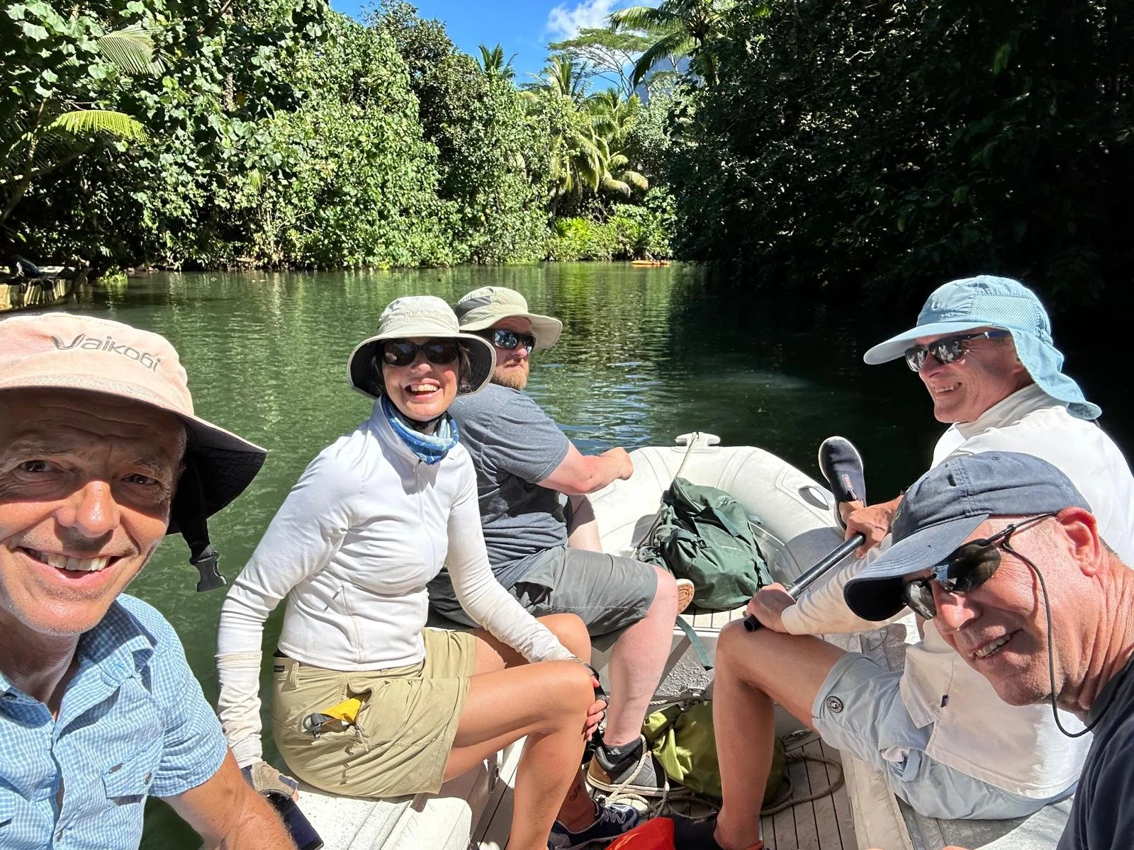 By afternoon, we dropped anchor in Fa’aroa Bay and set off up the river, some in kayaks, others in the dinghy. The jungle rose thick and green around us, and the water gurgled quietly beneath our hulls. Behind the trees, peaks loomed silently, watching.