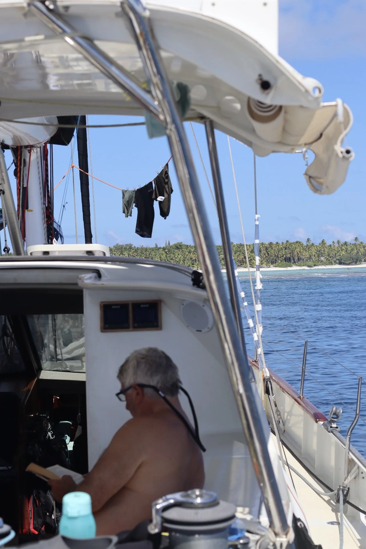 After three days at sea after our departure from Niue, we arrived in the early hours of the morning today to Palmerston island. What we expected to be an upwind bash the whole way, turned out to be a really lovely sail! We had blue skies and a consistent 10-15 knot breeze, often just southerly enough for us to leave the engine off and sail close-hauled while still making our heading. The crew spent the days reading, playing cards, eating delicious food, having cat naps between watches, and always keeping a diligent lookout of course! The adjustment period to life at sea seems to be over, as everyone appears much more comfortable onboard, and in the watch system compared to our first night.
