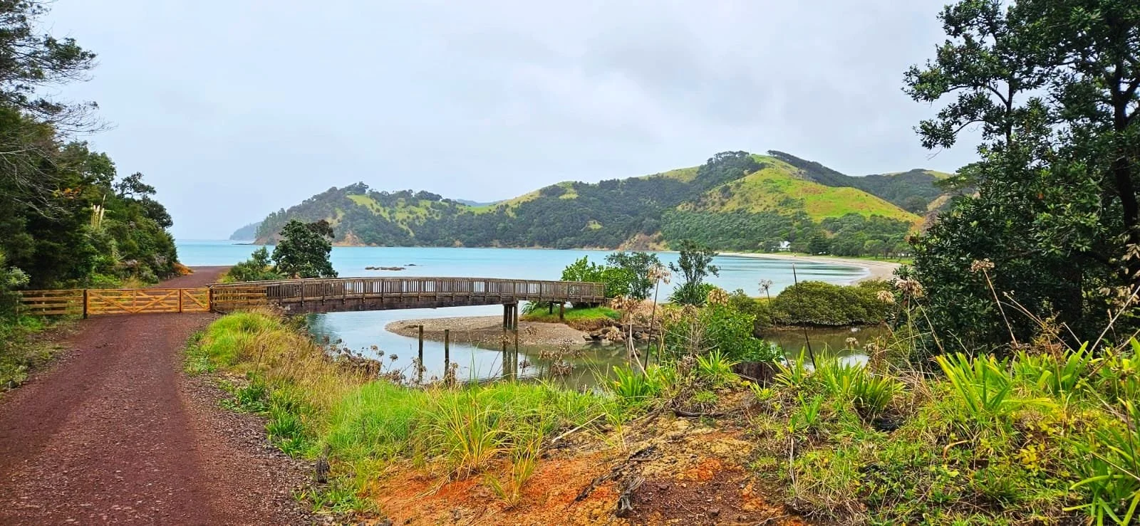 The bridge to nowhereThe crew woke up baying for adventure as the sun refused to get up and play. Infrequent showers were expertly dodged as Te Kaihōpara’s motley crew tucked into some energising chocolate bars and managed to get ashore at Man O’ War Bay. The tempting scent of fish pies motivated even the laziest of the bunch, (no one in particular!) to hike up to a nearby restaurant. Alas! No one had any cash! Ross quickly turned saviour with his digital wallet, as Mick finally nodded along in approval of something being good about the digital revolution of mankind.
