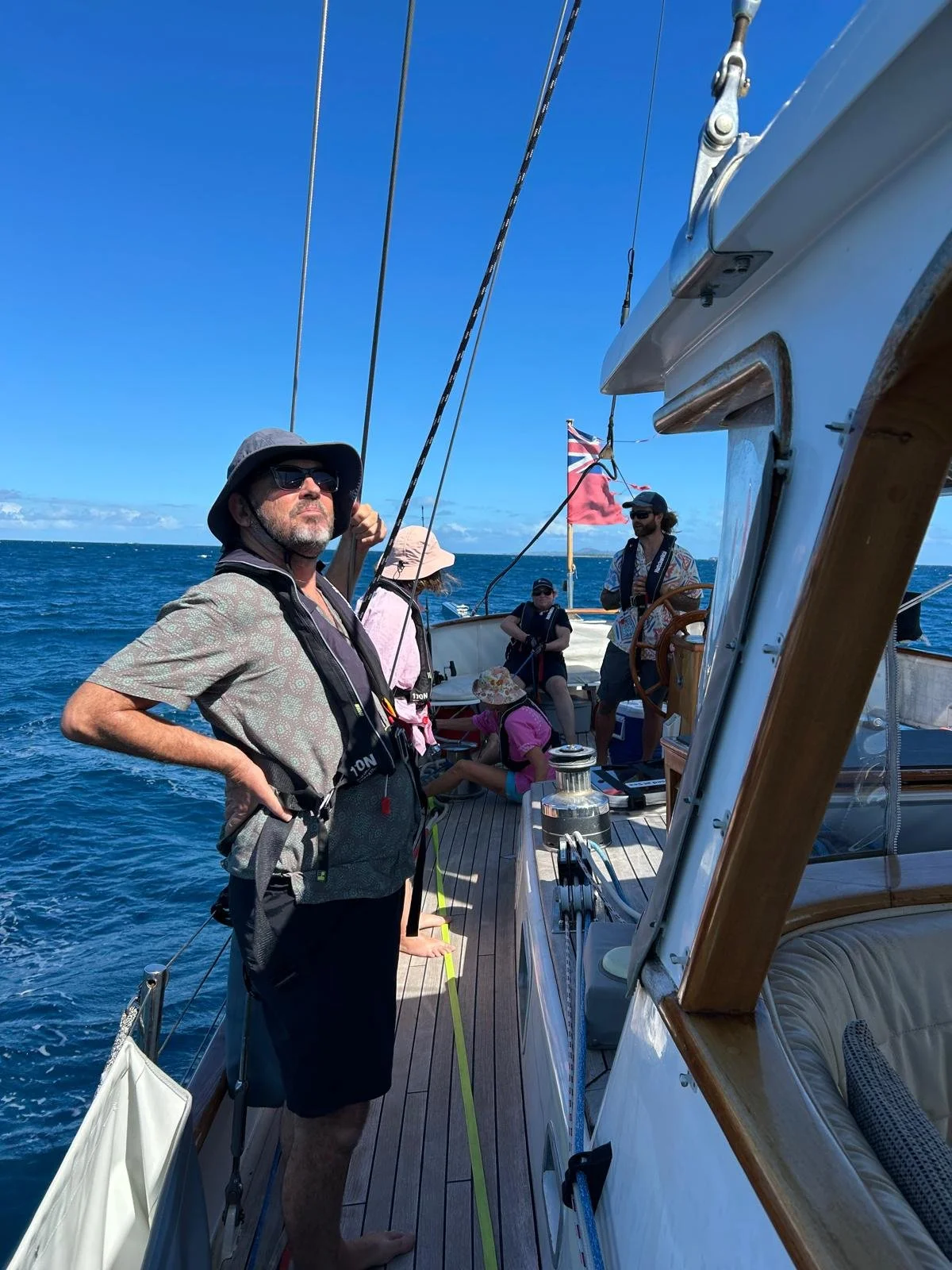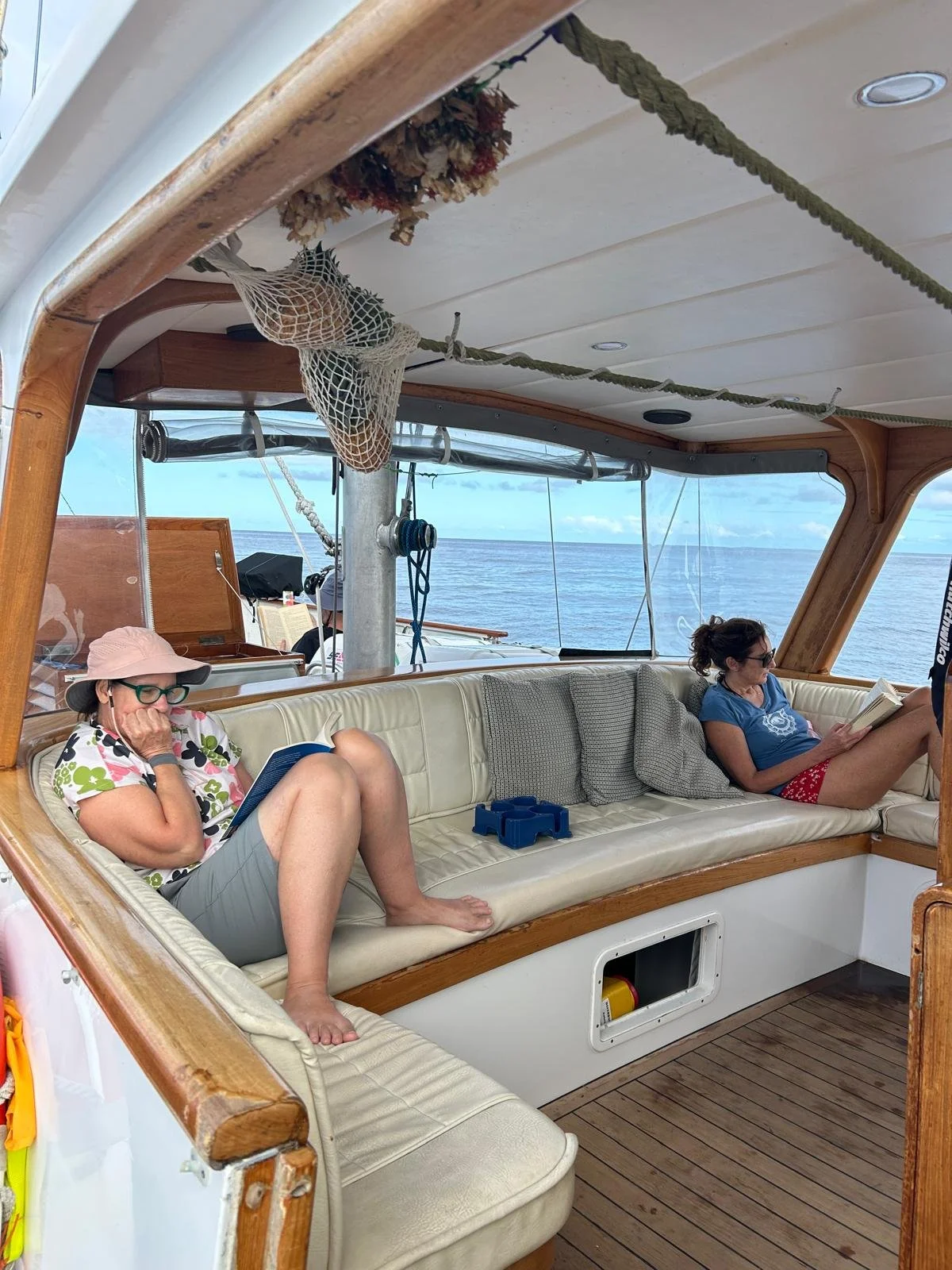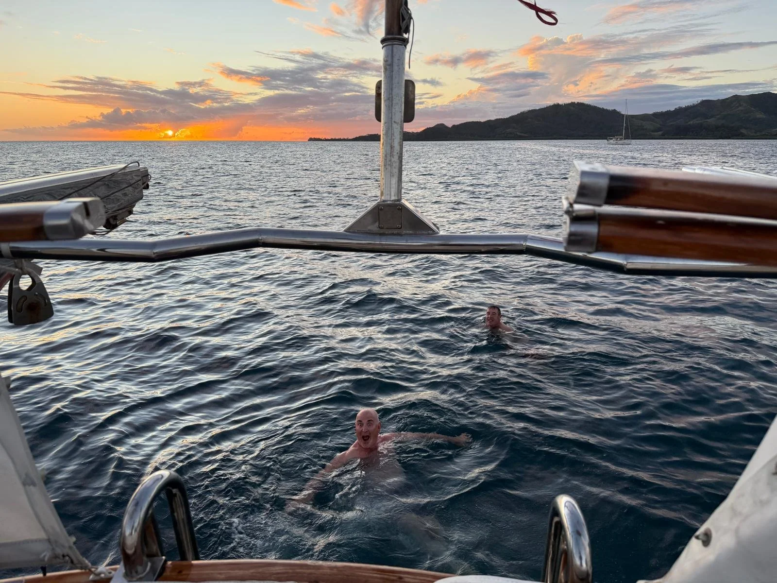 So far it’s day three of our first Yasawa Island cruise of the season and only one bait fish has been caught but not for lack of trying. Let me introduce Declan and Paul: they drop a fishing line out whenever they can. Amusingly watching their efforts are the rest of the crew: Ian, Heidi, Heather, and Suzi. As well as fishing, the crew are enjoying reading books in the shade during our cruisy sailing weather. We spent our first night on anchor at Musket Cove, before sailing north to Waya Island and onwards to Somosomo Bay. Tomorrow we go even further north to Nacula Island!